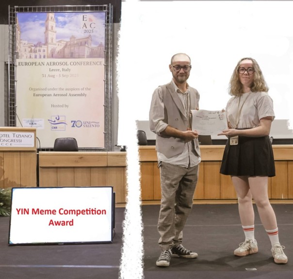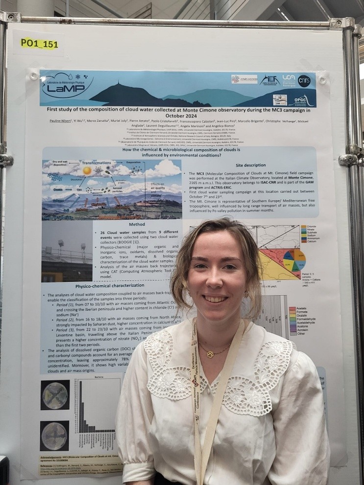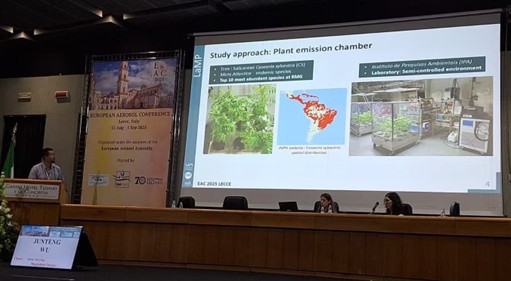 La conférence European Aerosol Conference 2025 (EAC2025) s’est tenue à Lecce, en Italie, du 31 août au 5 septembre. À cette occasion, le travail de Pauline Fombelle sur la formation d’aérosols organiques secondaires à partir de composés organiques volatiles biogéniques, mené dans le cadre du projet BIOMASP+, a été présenté oralement par Junteng Wu. Pauline Nibert a également contribué à la conférence en présentant sous la forme d’un poster pour montrer les premiers résultats de la campagne MC3 d’octobre 2024 (dans le cadre du projet OPTIC et financé par Atmos Access) sur l’analyse de la composition chimique et microbiologique de l’eau de nuage collectée au Monte Cimone.